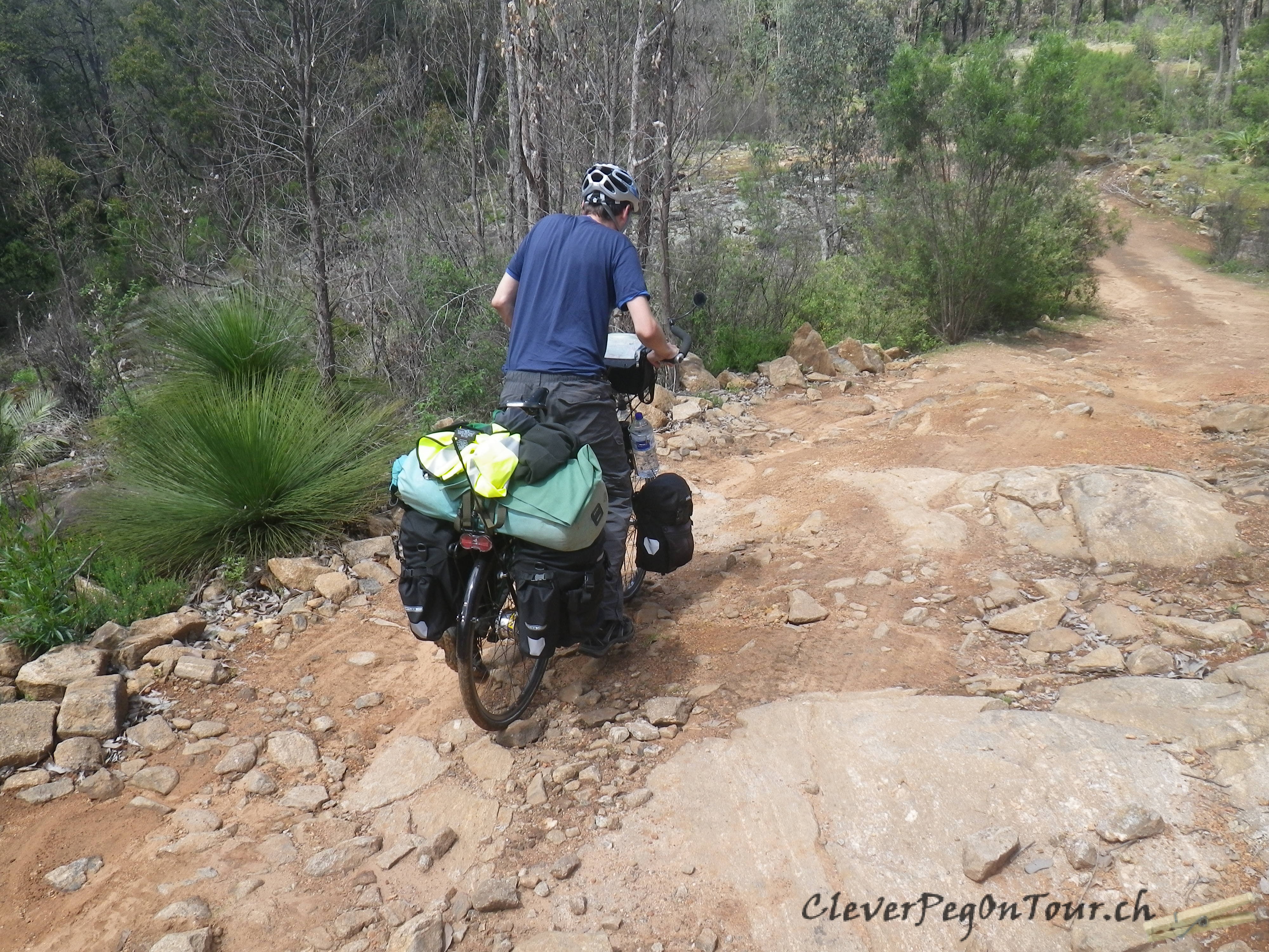 Bruno in Action. Unsere Velos sind eigentlich weniger für solche Pfade geeignet, da es sich um ausgesprochene Tourenvelos handelt. Oft mussten wir die Räder schieben, weil es einfach zu steil oder zu sandig war.