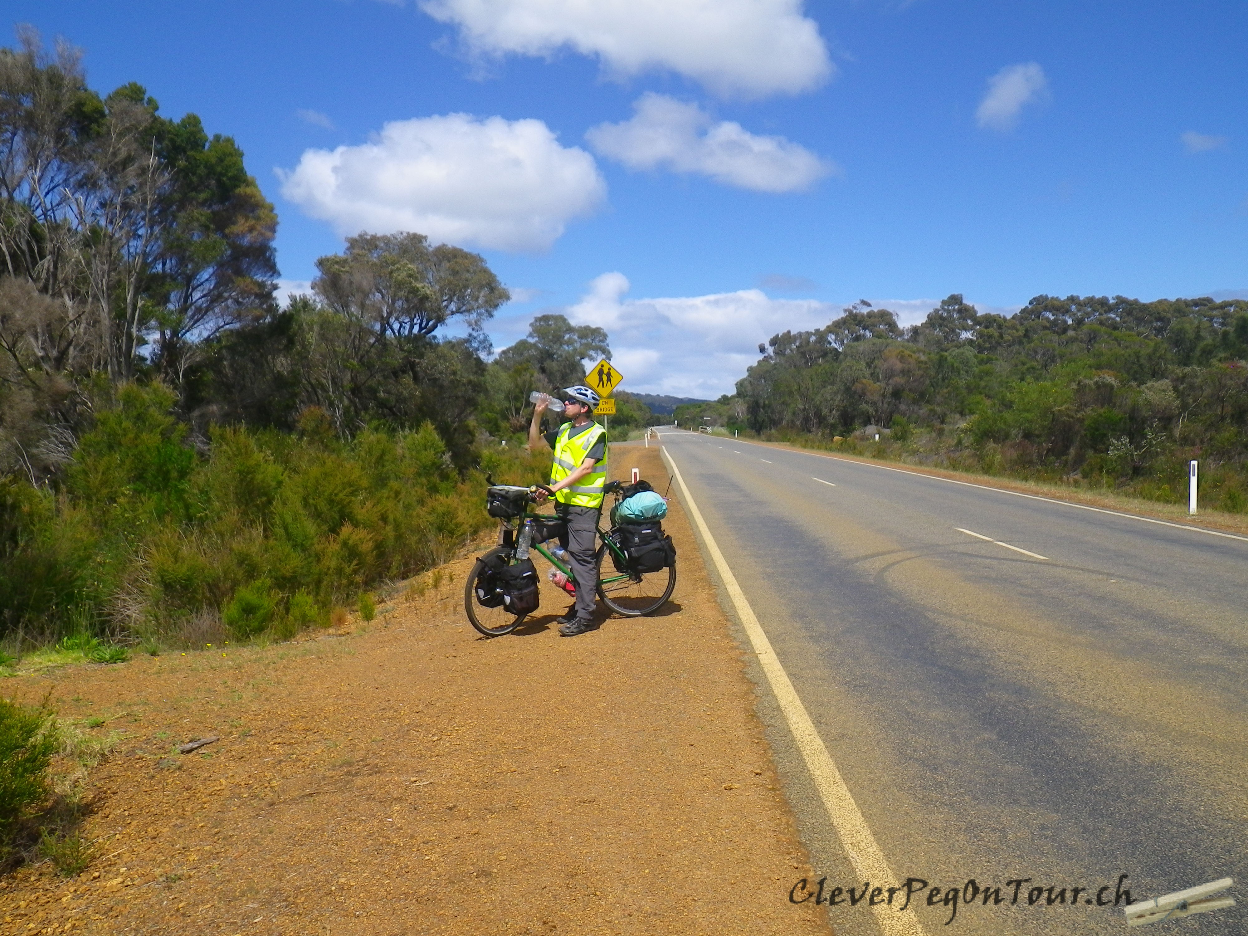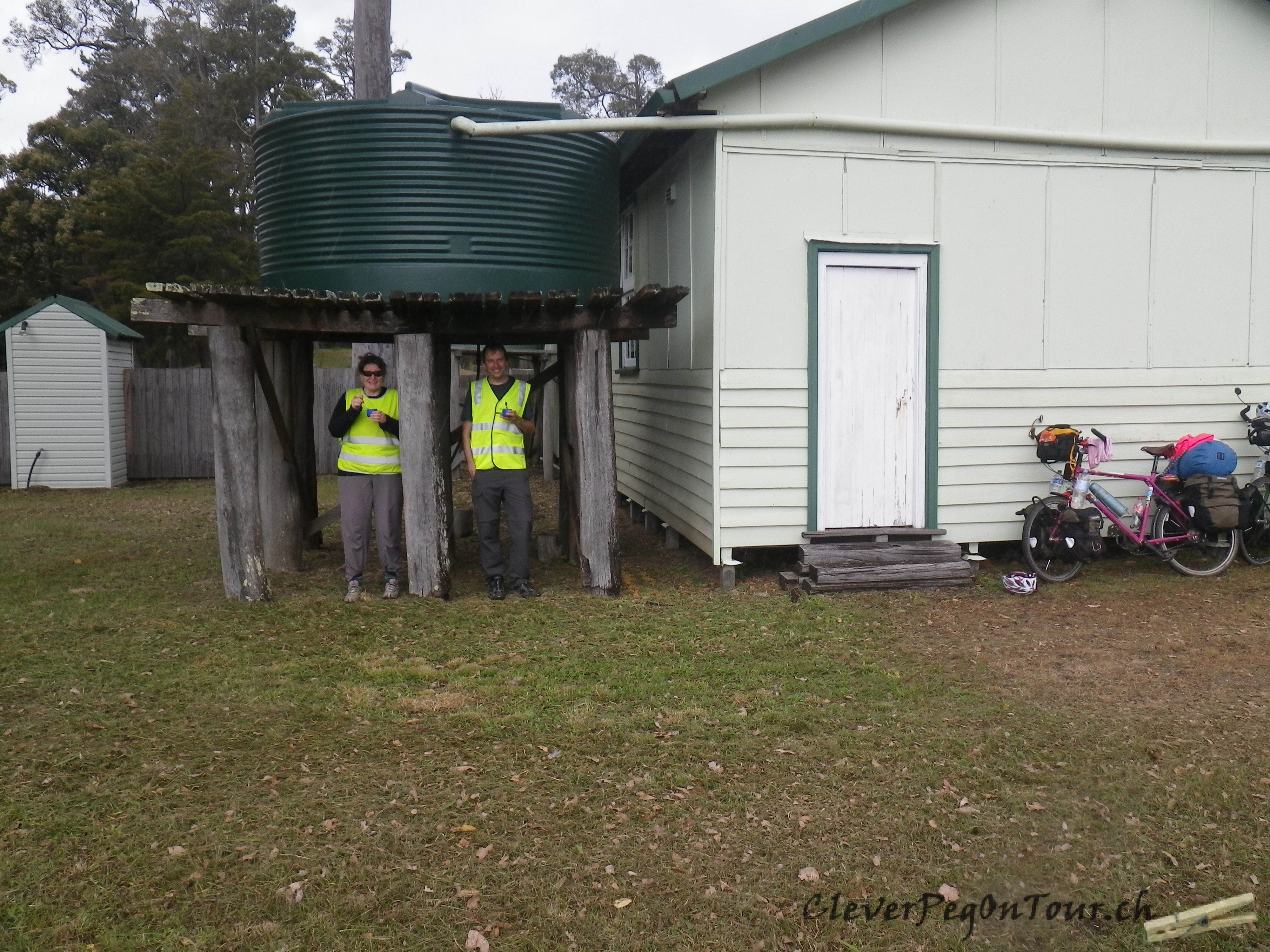 Unter einem Wassertank suchten wir kurz vor Quinninup Schutz vor dem Regen. Dazu assen wir eine warme Suppe. Am Morgen kochen wir uns heisses Wasser und füllen dies in die Thermoskanne. Zwei Bouillonwürfel rein und noch ein paar getrocknete Erbsen und klein geschnittene Karotten. Bis zum Mittag ist das dann eine wunderbare Suppe.