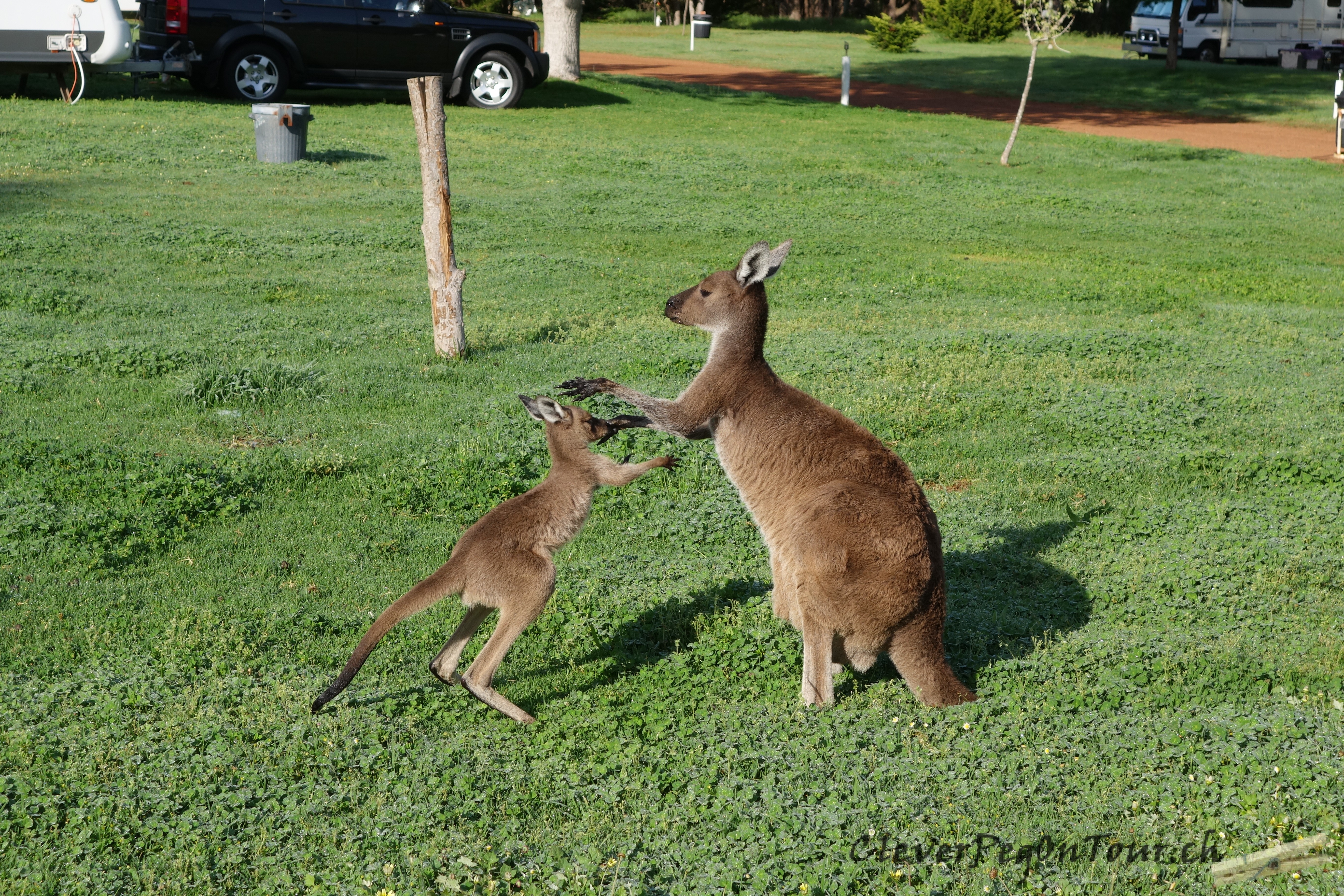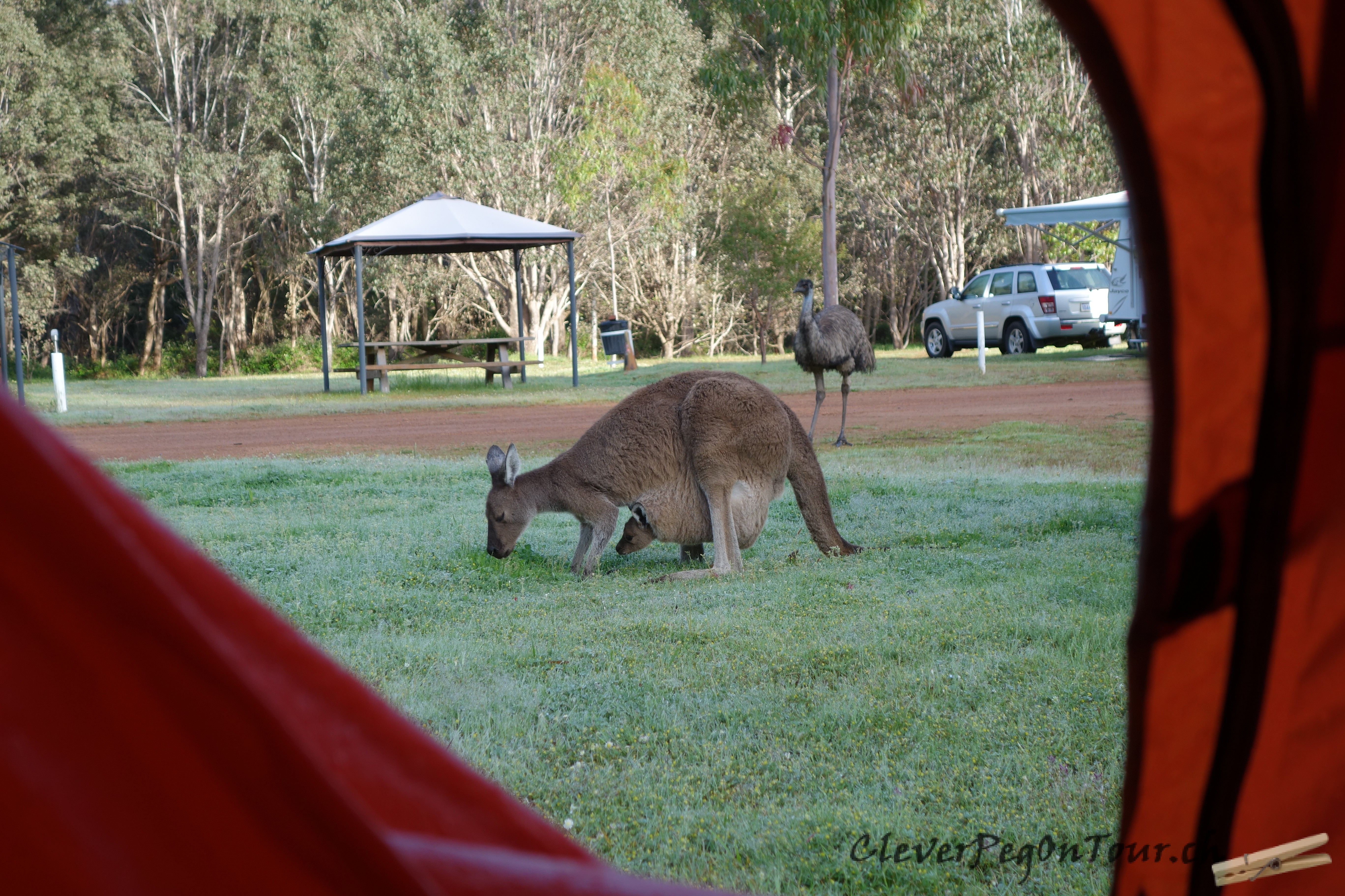 Morgens um 6 Uhr staunten wir nicht schlecht, als wir das Zelt aufmachten und uns dieses Känguruh-Mami und ein Emu begrüssten.