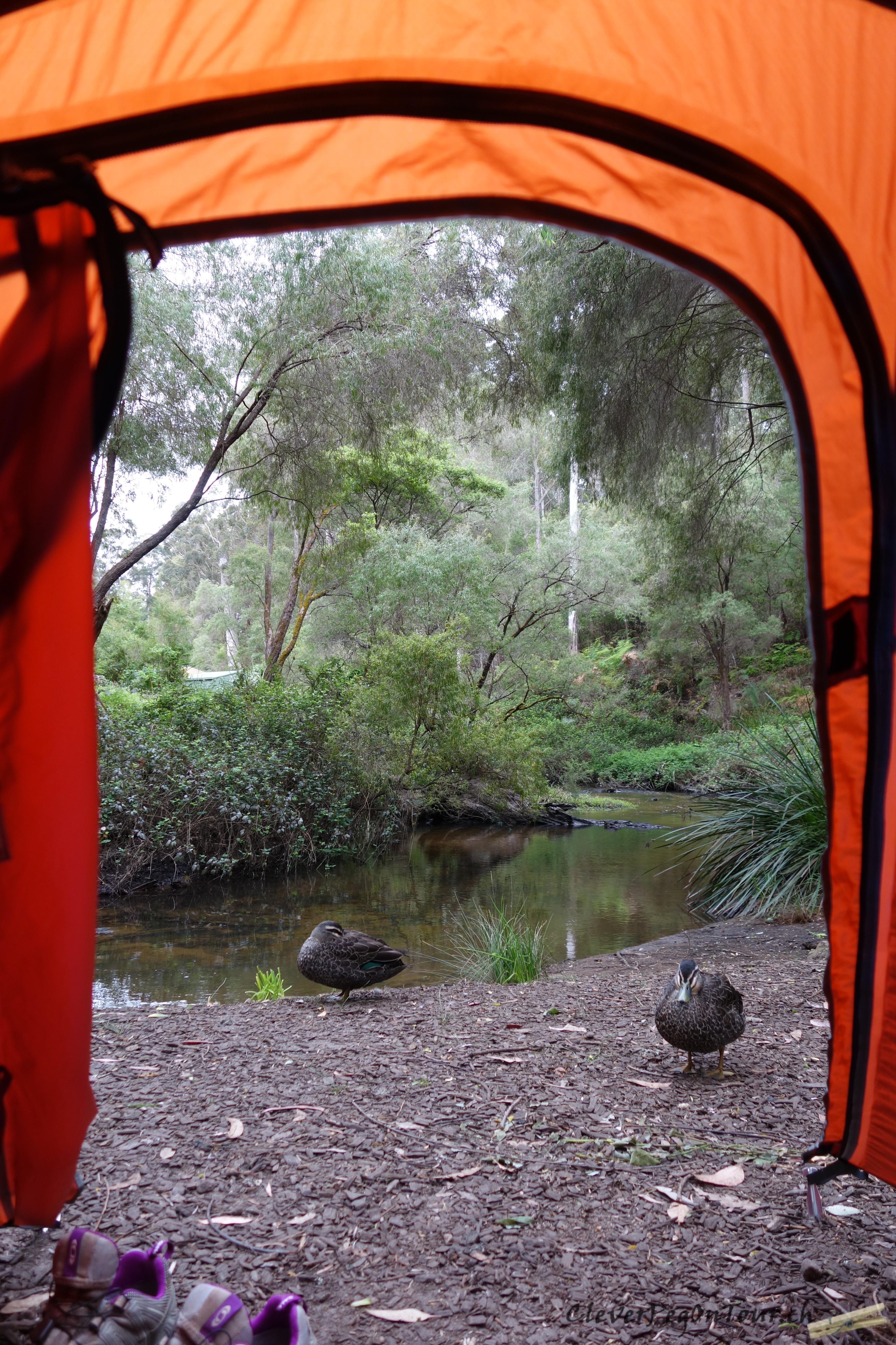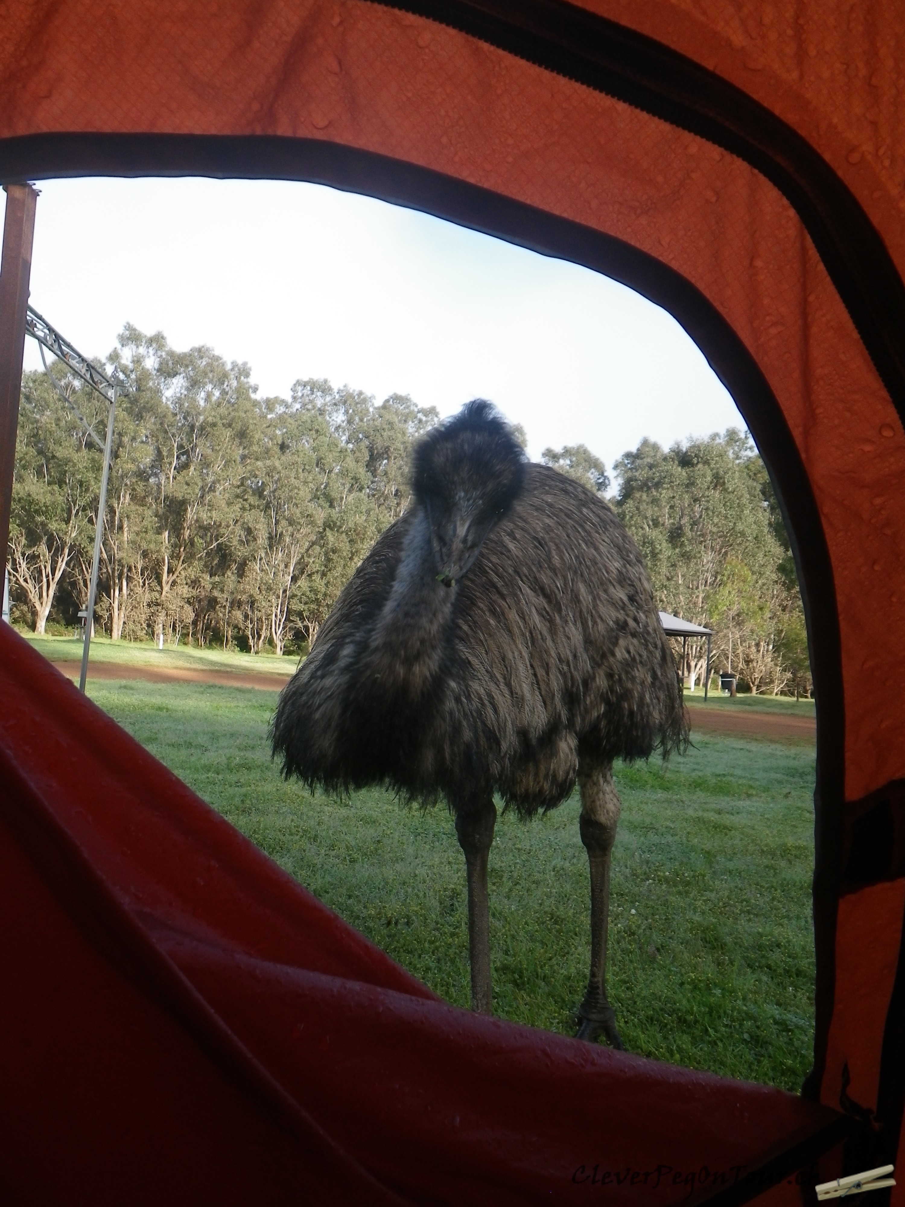 Der Emu wollte dann noch etwas genauer wissen, wer da im Zelt wohnt und streckte neugierig seinen Kopf zu uns rein.