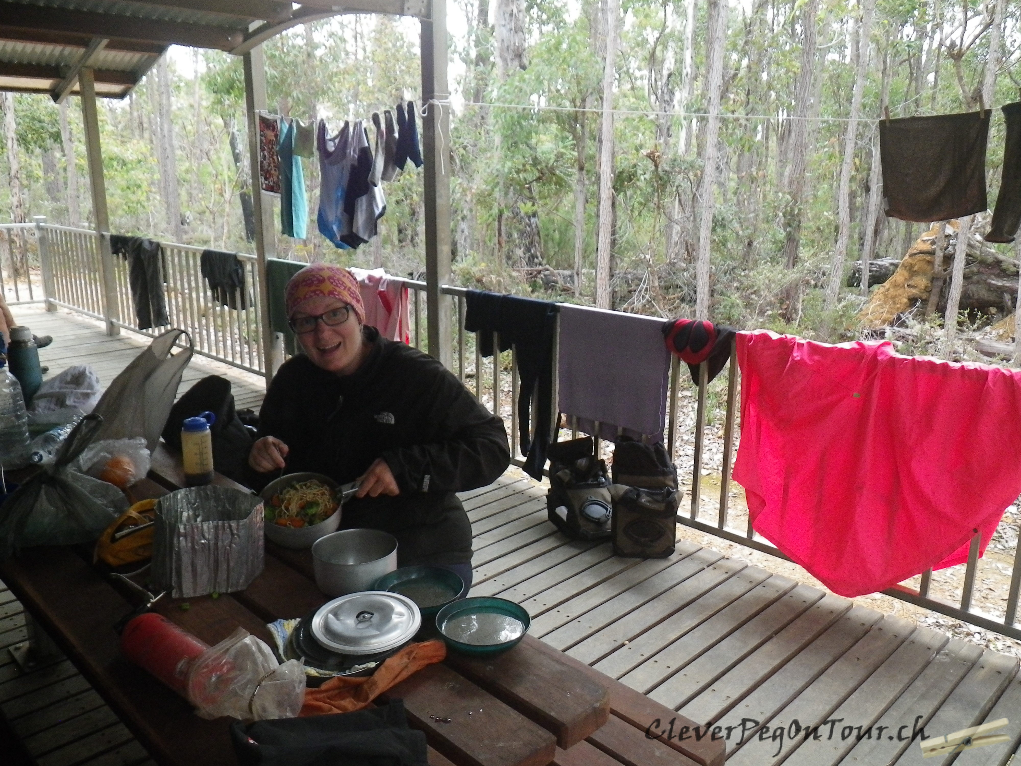 Eine weitere Hütte auf dem Munda Biddi Trail. Die Hütten haben wunderschöne Namen. Diese heisst “Yirra Kartta”. Zum Znacht gab es Nudeln mit Gemüse.