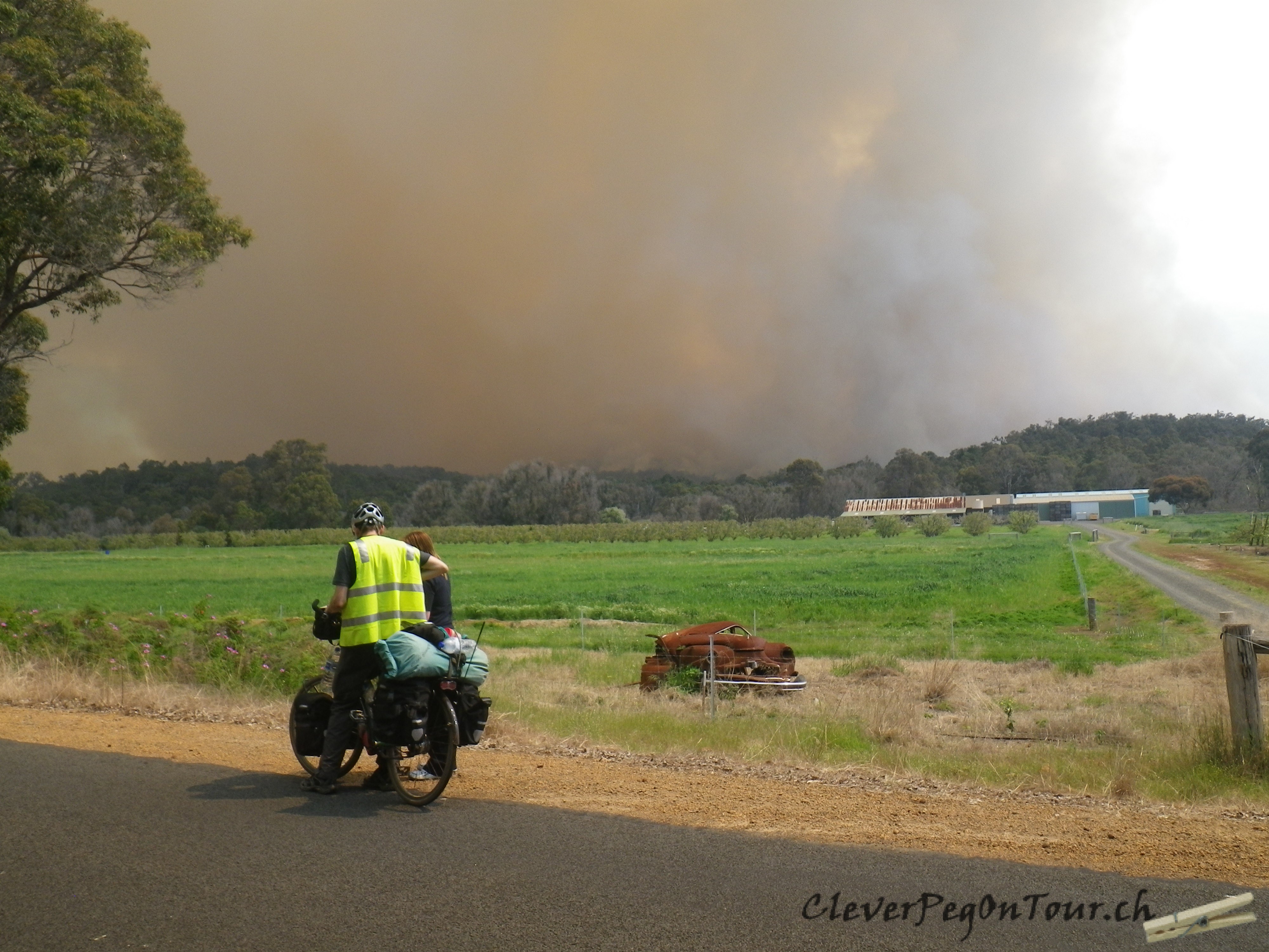 Kurz vor Donnybrook, WA, sahen wir Rauch im Wald aufsteigen. Unser Trail würde genau durch diesen Wald führen. Wir entschlossen uns auf der Strasse zu bleiben und auf dem Highway in die kleine Stadt zu fahren. Während der Fahrt hatte man das Gefühl als würde es leicht schneien. Dabei handelte es sich nur um Asche, welche vom Himmel rieselte.