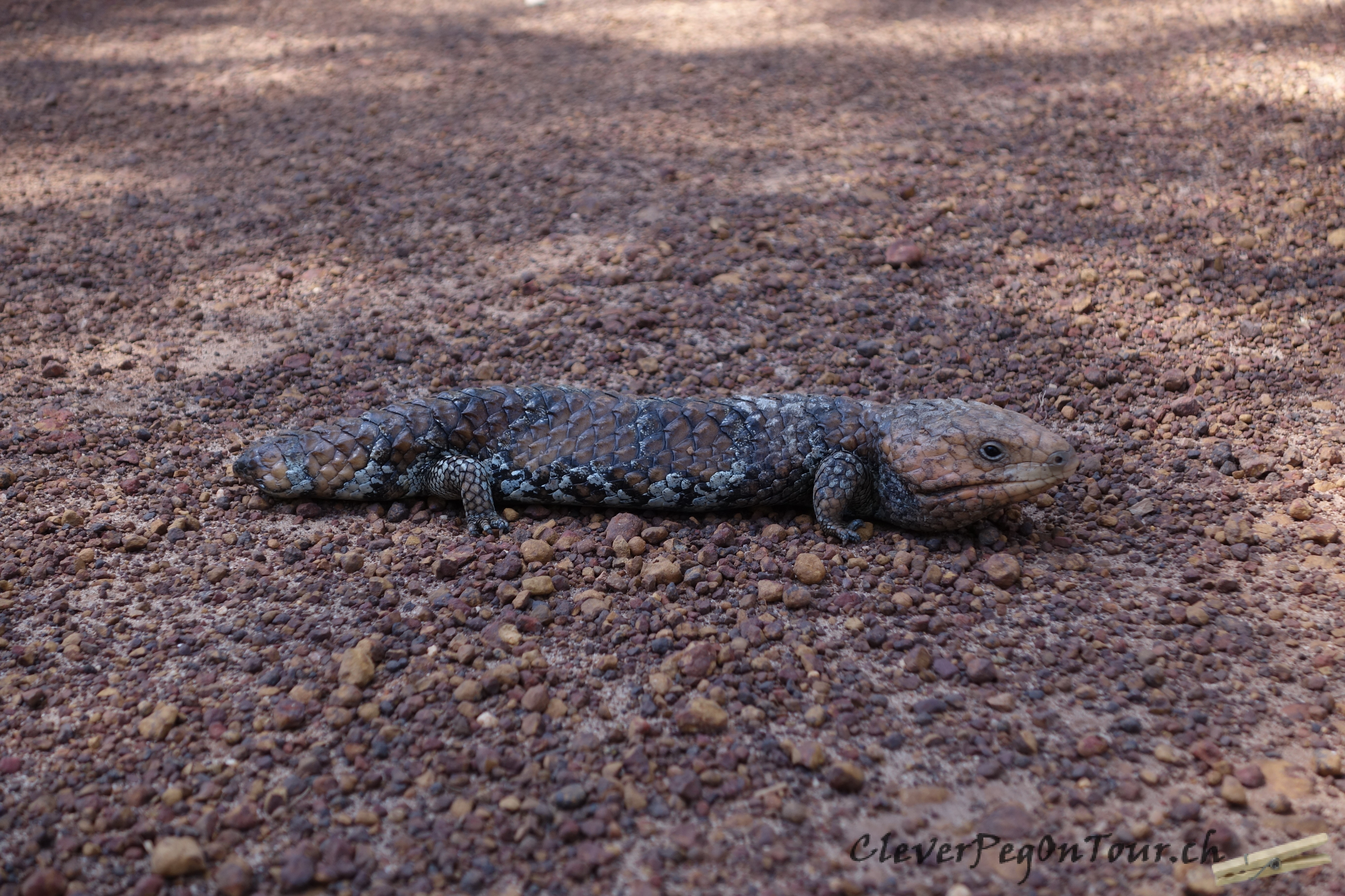 Die Tannenzapfenechsen sind recht träge und fürchten sich nicht vor Menschen. Sie leben im trockenen Buschland. Ihre Ernährung besteht aus Insekten, Würmern, Schnecken, Pflanzen und Beeren. Sie lieben es, sich auf der warmen Strasse zu sonnen, was ihnen dann oft zum Verhängnis wird. Sie werden ca. 30-40 cm lang. Diese kleinen Reptilien sehen wir ziemlich oft.